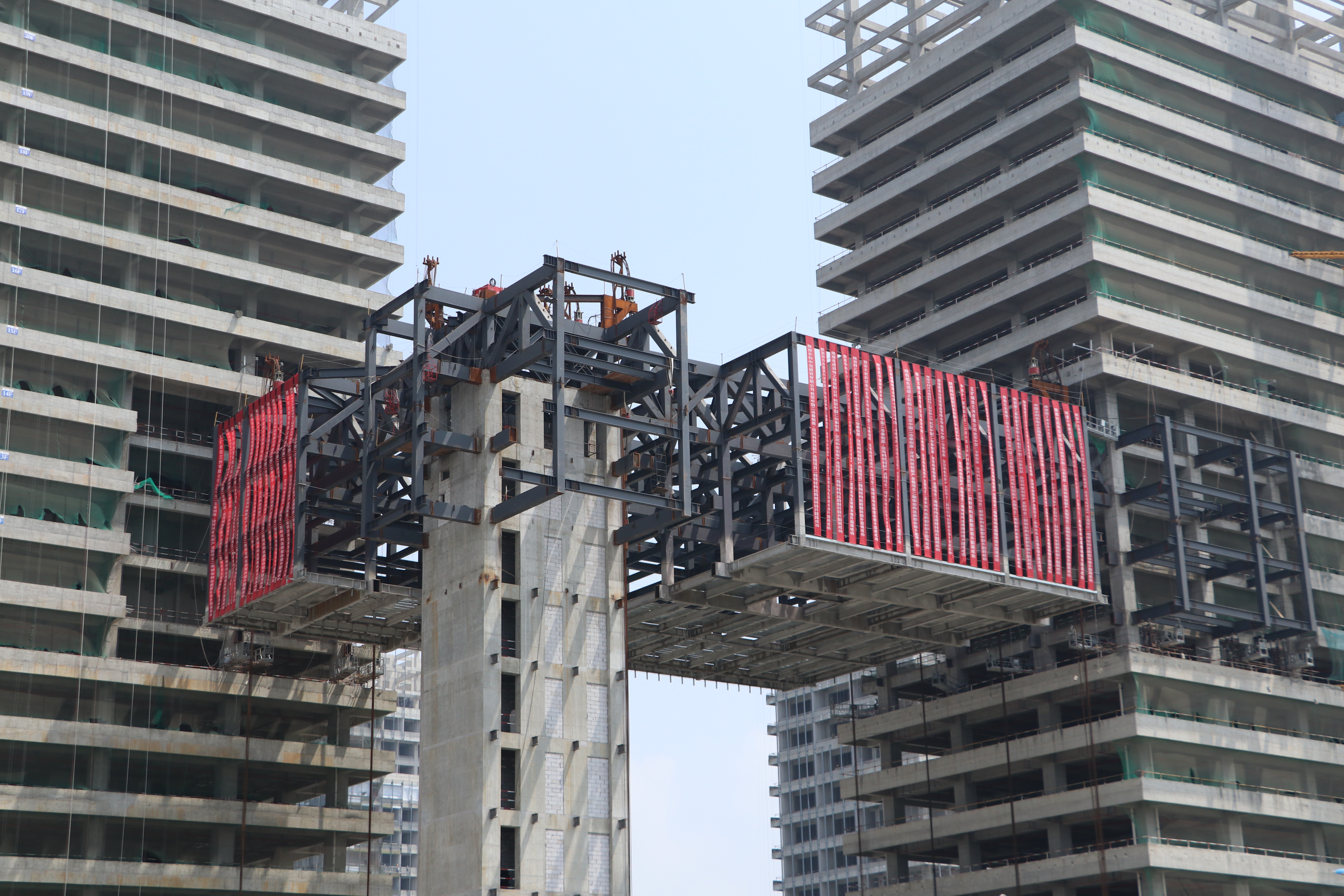 在本次提升工程中,項(xiàng)目部精心組織、科學(xué)施工,采用了先進(jìn)的鋼桁架結(jié)構(gòu)體系。鋼結(jié)構(gòu)連廊重達(dá)1818噸,距地高度59.85米,跨度44米,寬度30米。為確保施工安全和精準(zhǔn)對(duì)接,項(xiàng)目部在1#、2#及塔樓建筑之間設(shè)置了10個(gè)吊點(diǎn),并通過(guò)鋼絞線由計(jì)算機(jī)控制10臺(tái)液壓提升器同步發(fā)力,以每小時(shí)4.2米的速度緩慢拉升。同時(shí),項(xiàng)目部還采用了全站儀、水準(zhǔn)儀、超聲探傷儀、漆膜儀、硬度儀等設(shè)備進(jìn)行實(shí)時(shí)監(jiān)測(cè),確保鋼結(jié)構(gòu)連廊在提升過(guò)程中不出現(xiàn)“水平誤差”,保障每一個(gè)鋼構(gòu)件受力處于安全可控狀態(tài)。經(jīng)過(guò)11個(gè)小時(shí)的奮戰(zhàn),提升作業(yè)順利完成,兩座高聳入云的大樓在59.85米的高度成功實(shí)現(xiàn)高空交匯,標(biāo)志著項(xiàng)目建設(shè)取得重要階段性成果。
