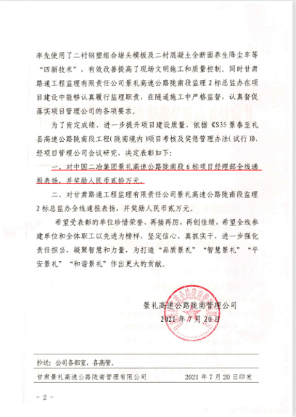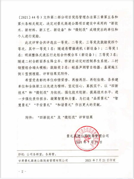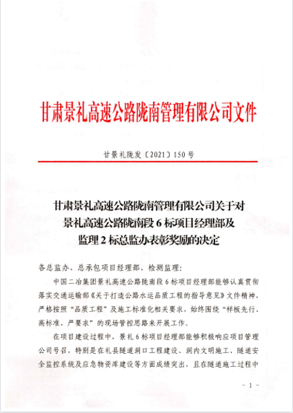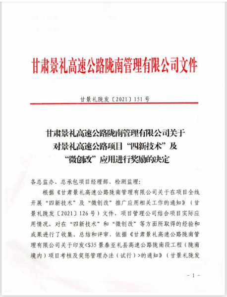 近日,甘肅分公司景禮項目部在甘肅景禮高速公路隴南管理有限公司組織的“四新技術(shù)”、“微創(chuàng)改”推廣應(yīng)用、“品質(zhì)工程”及施工標準化建設(shè)等檢查評比中名列前茅,項目管理公司對景禮項目部進行通報表揚,并給予獎勵40萬元。