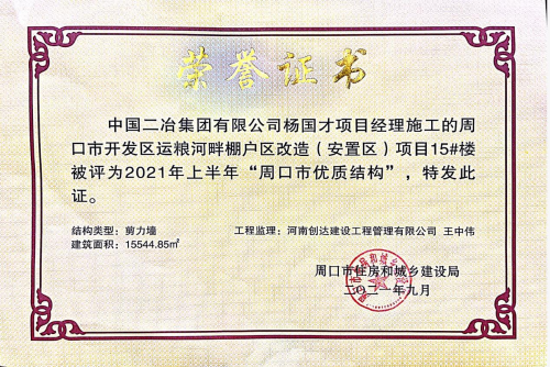 10月14日,由中國二冶新型建筑分公司承建施工的周口市運(yùn)糧河畔棚戶區(qū)改造(安置區(qū))項(xiàng)目15#樓被評為2021年上半年“周口市優(yōu)質(zhì)結(jié)構(gòu)”工程獎。