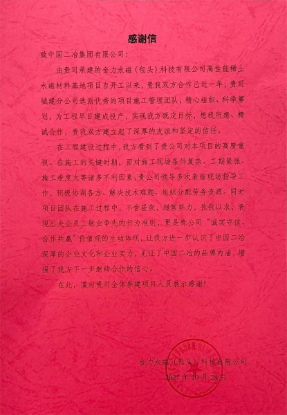 11月4日,在項目開工建設(shè)一周年之際,金力永磁(包頭)科技有限公司向中國二冶集團(tuán)發(fā)來一封沉甸甸的感謝信,對中國二冶金力永磁項目部參建人員良好的工作作風(fēng)和嚴(yán)謹(jǐn)?shù)墓ぷ鲬B(tài)度表示感謝由衷。