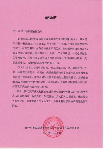 11月12日,中國二冶集團赤峰市開發(fā)試驗區(qū)高新技術(shù)產(chǎn)業(yè)中試孵化基地(一期)建設(shè)工程一標(biāo)段施工項目收到來自赤峰市資源型城市經(jīng)濟轉(zhuǎn)型開發(fā)試驗區(qū)管理委員會發(fā)來的表揚信,對中國二冶的大力支持、精心部署和項目團隊在施工過程中表現(xiàn)出的良好敬業(yè)精神、專業(yè)的技術(shù)能力、攻堅克難的實干精神及“用戶至上”的契約精神給予了高度肯定和贊揚。