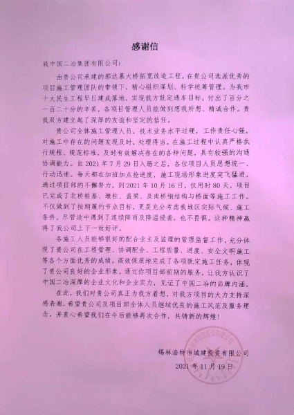11月19日,錫林浩特市城建投資有限公司發(fā)來感謝信,對(duì)中國二冶在錫林浩特市那達(dá)慕大橋拓寬改造工程中良好的履約精神給予高度認(rèn)可,對(duì)參與項(xiàng)目建設(shè)的全體人員付出的努力和汗水表示感謝。