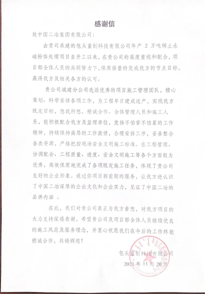 11月22日,業(yè)主方為中國(guó)二冶城建分公司承建的包頭堇創(chuàng)科技有限公司年產(chǎn)2萬(wàn)噸稀土永磁粉體處理項(xiàng)目送來(lái)一封沉甸甸的感謝信,感謝中國(guó)二冶圓滿完成包頭堇創(chuàng)項(xiàng)目各項(xiàng)工作。