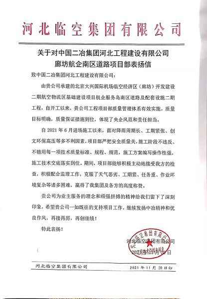 11月22日,中國(guó)二冶河北廊坊航企南區(qū)道路項(xiàng)目部收到河北臨空集團(tuán)有限公司表?yè)P(yáng)信,對(duì)中國(guó)二冶的服務(wù)理念和頑強(qiáng)拼搏精神高度贊揚(yáng)。
