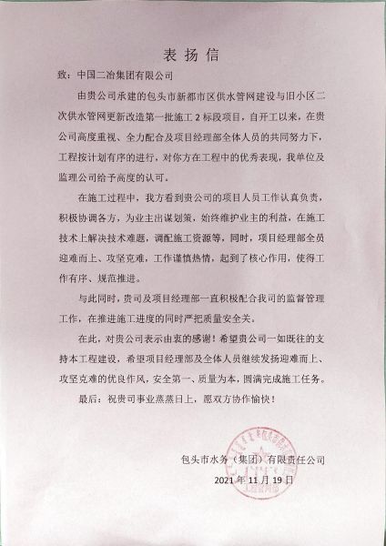 11月24日,包頭市水務(wù)(集團(tuán))有限責(zé)任公司向中國二冶發(fā)來表揚(yáng)信,對中國二冶在新都市區(qū)供水管網(wǎng)建設(shè)與舊小區(qū)二次供水管網(wǎng)更新改造第一批施工2標(biāo)段項(xiàng)目的建設(shè)中用實(shí)際行動踐行的“一天也不耽誤,一天也不懈怠”的企業(yè)精神及項(xiàng)目人員優(yōu)秀的專業(yè)素質(zhì)和過硬的技術(shù)水平給予充分的肯定和高度贊揚(yáng),對管道公司領(lǐng)導(dǎo)給予該工程的重視支持及項(xiàng)目建設(shè)人員的付出與努力表示衷心感謝。