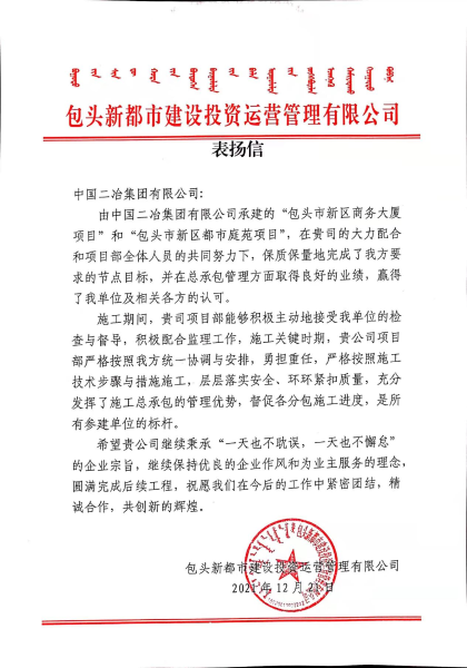 12月21日,包頭新都市建設投資運營管理有限公司致中國二冶表揚信。衷心感謝中國二冶各級領導和全體員工的共同努力,保質保量完成包頭市新都市區(qū)商務大廈、新都市區(qū)都市庭苑項目各項網(wǎng)絡節(jié)點目標,取得良好業(yè)績,贏得各方的稱贊和認可。