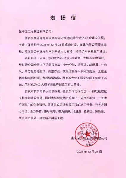 12月24日,南京金江冶金爐料有限公司再次向中國二冶致表揚(yáng)信,對土建主體結(jié)構(gòu)成功封頂提出表揚(yáng),同時對中國二冶在C2倉項(xiàng)目工程建設(shè)中所展現(xiàn)出的高水平施工作業(yè)與高效化管理能力表示高度肯定。