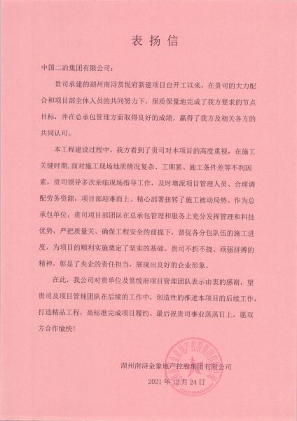 12月28日,湖州南潯金象地產(chǎn)控股集團(tuán)有限公司致中國二冶表揚(yáng)信。信中對中國二冶路橋分公司南潯賞悅府住宅小區(qū)新建工程項(xiàng)目部夜以繼日、靶向管理、有序施工,保質(zhì)保量地完成業(yè)主方要求節(jié)點(diǎn)目標(biāo),用實(shí)際行動闡釋工程建設(shè)高效履約表示高度贊揚(yáng)。