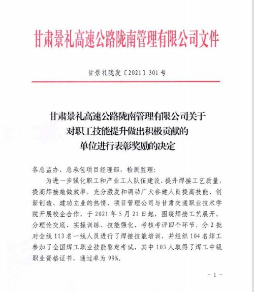 為進(jìn)一步強化職工和產(chǎn)業(yè)工人隊伍建設(shè),提升焊接工藝質(zhì)量,提高焊接施做效率,充分激發(fā)和調(diào)動廣大參建人員提高技能、創(chuàng)新創(chuàng)造、建功立業(yè)的熱情,從2021年5月21日起,甘肅景禮高速公路隴南管理有限公司與甘肅交通職業(yè)技術(shù)學(xué)院開展校企合作,圍繞焊接工藝展開,分理論交底、實操訓(xùn)練、技能強化、考核考評四個環(huán)節(jié),分批次對全線113名一線人員進(jìn)行了焊接技能培訓(xùn),并組織104名焊工參加了全國焊工職業(yè)技能鑒定考試,其中103人取得了焊工中級職業(yè)資格證書,通過率為99%。