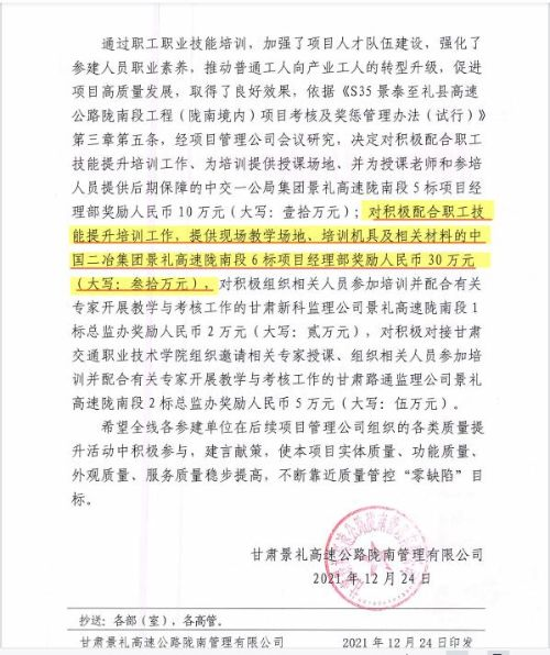 12月29日,中國二冶景禮項目部在甘肅景禮高速公路隴南管理有限公司組織的職工技能提升活動中,做出突出貢獻(xiàn),受到項目管理公司嘉獎30萬元。