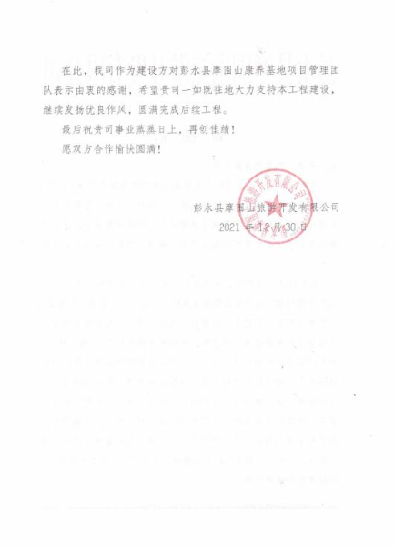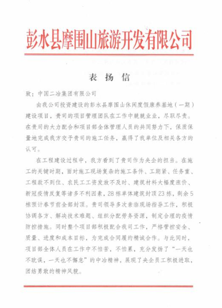 1月4日,中國(guó)二冶內(nèi)蒙古分公司項(xiàng)目經(jīng)理部收到項(xiàng)目建設(shè)方彭水縣摩圍山旅游開發(fā)有限公司表?yè)P(yáng)信,信中對(duì)中國(guó)二冶集團(tuán)內(nèi)蒙古分公司在項(xiàng)目建設(shè)中履行央企責(zé)任、彰顯央企實(shí)力與擔(dān)當(dāng)給予高度贊譽(yù)。