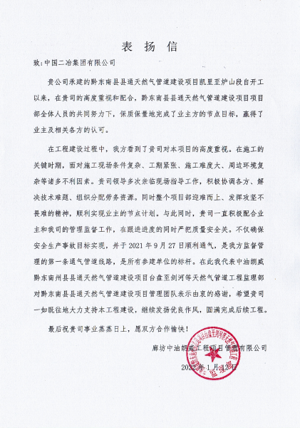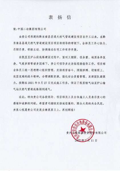 貴州東黎投資股份有限公司在表?yè)P(yáng)信中指出,在凱里至爐山段線路建設(shè)過(guò)程中,面對(duì)工期緊、任務(wù)重、地質(zhì)條件復(fù)雜、氣候多雨等諸多困難下,中國(guó)二冶領(lǐng)導(dǎo)多次親臨現(xiàn)場(chǎng)指導(dǎo)工作,項(xiàng)目部全體員工統(tǒng)一思想精細(xì)組織管理,合理調(diào)配資源,強(qiáng)化安全質(zhì)量管理、發(fā)揮團(tuán)隊(duì)凝聚力,按照計(jì)劃節(jié)點(diǎn)日期完成施工任務(wù),保證了凱里輸氣站至爐山輸氣站天然氣管道線路順利通氣,在此向中國(guó)二冶表示衷心的感謝和誠(chéng)摯的問(wèn)候。同時(shí),希望中國(guó)二冶繼續(xù)發(fā)揚(yáng)誠(chéng)信履約、顧全大局的央企風(fēng)范,與我方實(shí)現(xiàn)合作共贏,圓滿完成施工任務(wù)。