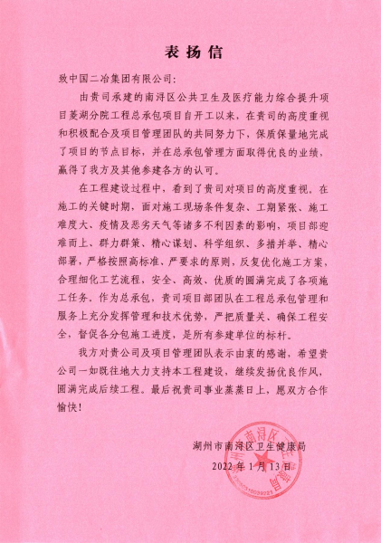 1月15日,中國二冶收到湖州市南潯區(qū)衛(wèi)生健康局表揚(yáng)信,信中對中國二冶路橋分公司菱湖分院項(xiàng)目部在工程總承包管理和服務(wù)上充分發(fā)揮管理和技術(shù)優(yōu)勢,嚴(yán)把質(zhì)量關(guān)、確保工程安全,全力搶抓施工進(jìn)度予以肯定。