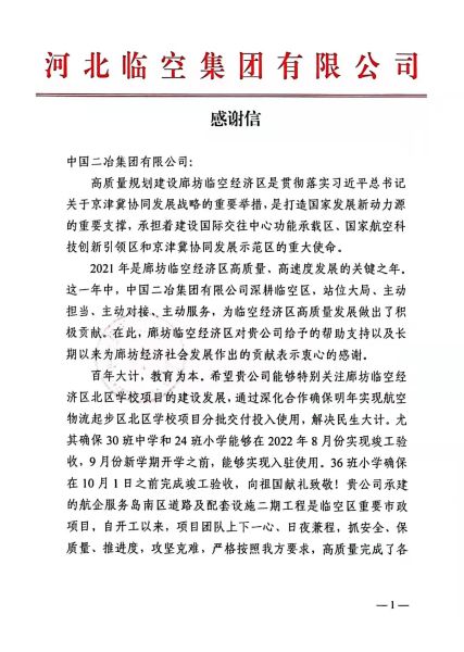 1月21日,中國(guó)二冶廊坊航空物流起步區(qū)北區(qū)學(xué)校工程項(xiàng)目、廊坊航空物流起步區(qū)南區(qū)道路工程項(xiàng)目收到來(lái)自甲方河北臨空集團(tuán)有限公司發(fā)來(lái)的表?yè)P(yáng)信。