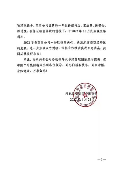 信中指出,在過去的一年里,中國(guó)二冶深耕臨空區(qū),站位大局、主動(dòng)擔(dān)當(dāng)、主動(dòng)對(duì)接、主動(dòng)服務(wù),為臨空經(jīng)濟(jì)區(qū)高質(zhì)量發(fā)展做出了積極貢獻(xiàn)。中國(guó)二冶臨空經(jīng)濟(jì)區(qū)學(xué)校與道路兩項(xiàng)目部積極克服諸多建設(shè)難題,科學(xué)組織、搶抓工期,全力以赴推進(jìn)項(xiàng)目建設(shè),高質(zhì)量完成各項(xiàng)建設(shè)任務(wù)。希望項(xiàng)目部永葆初心使命,雷厲風(fēng)行、使命必達(dá),繼續(xù)高標(biāo)準(zhǔn)、高質(zhì)量完成后續(xù)建設(shè)任務(wù),同時(shí)關(guān)注廊坊臨空經(jīng)濟(jì)區(qū)的發(fā)展,進(jìn)一步加強(qiáng)雙方對(duì)接,深化合作推動(dòng)實(shí)現(xiàn)互惠共贏,共同成就美好未來(lái)。