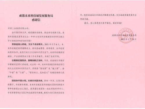 1月29日,成都未來科技城發(fā)展服務局致中國二冶感謝信,
