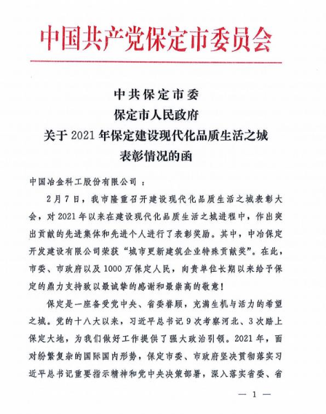 3月7日,中國(guó)二冶收到保定市委、市政府發(fā)來(lái)的《關(guān)于2021年保定建設(shè)現(xiàn)代化品質(zhì)生活之城表彰情況的函》。函中對(duì)包括中國(guó)二冶集團(tuán)在內(nèi)的中冶集團(tuán)各參建單位在2021年保定建設(shè)現(xiàn)代化品質(zhì)生活之城進(jìn)程中作出的積極貢獻(xiàn)表示感謝。