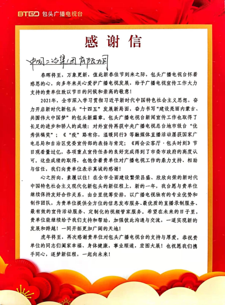 近日,中國二冶收到包頭廣播電視臺感謝信,信中對中國二冶多年來關(guān)心愛護(hù)包頭廣播電視發(fā)展,給予包頭廣播電視宣傳工作大力支持表示感謝,對中國二冶在2022年包頭廣播電視臺春節(jié)聯(lián)歡晚會中文化賦能、品牌推介和全程助力表示崇高的敬意。