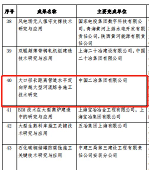 4月12日,中國安裝協(xié)會(huì)公布《關(guān)于公布2022年中國安裝協(xié)會(huì)科學(xué)技術(shù)進(jìn)步獎(jiǎng)評(píng)選結(jié)果的通知》的正式文件。中國二冶申報(bào)的《大口徑長距離管道水平定向穿越大型河流綜合施工技術(shù)研究》首次斬獲中國安裝協(xié)會(huì)科學(xué)進(jìn)步獎(jiǎng)二等獎(jiǎng)。