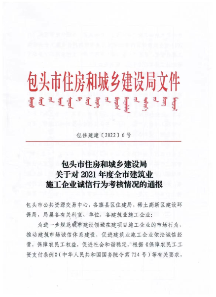 4月17日,中國二冶收到包頭市住房和城鄉(xiāng)建設(shè)局發(fā)布的《包頭市住房和城鄉(xiāng)建設(shè)局關(guān)于對2021年度全市建筑業(yè)施工企業(yè)誠信行為考核情況的通報》,對中國二冶在建筑市場的誠信行為予以表揚。