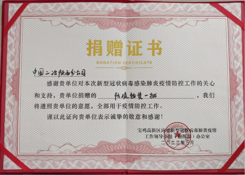4月28日,中國(guó)二冶陜西分公司收到寶雞市高新區(qū)管委會(huì)捐贈(zèng)證書,對(duì)中國(guó)二冶在寶雞市疫情防控關(guān)鍵階段提供的大力支持表示由衷的感謝。