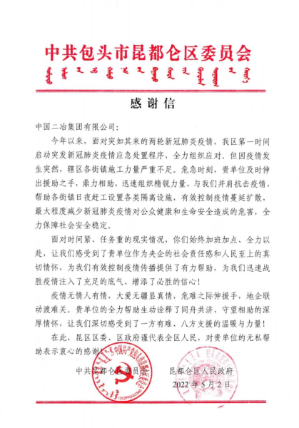 疫情無情,企業(yè)有愛。5月2日,中國二冶收到包頭市昆區(qū)區(qū)委、區(qū)政府發(fā)來的感謝信,感謝中國二冶在面對包頭市今年以來突如其來的兩輪新冠肺炎疫情中鼎力相助、勇于擔當?shù)母叨壬鐣?zé)任感和人民至上的真切情懷。