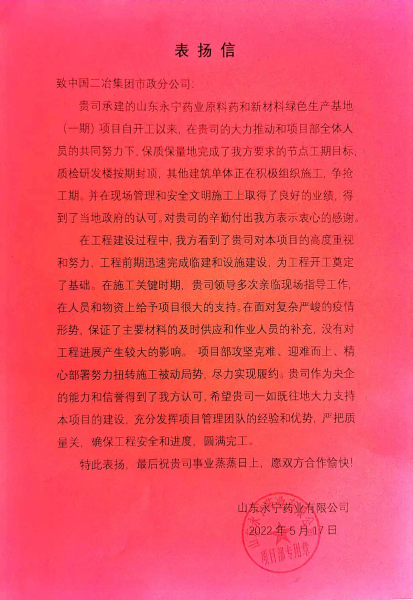 5月17日,中國(guó)二冶收到山東永寧藥業(yè)有限公司發(fā)來(lái)的感謝信,信中贊揚(yáng)中國(guó)二冶在山東永寧藥業(yè)項(xiàng)目建設(shè)過(guò)程中,實(shí)干擔(dān)當(dāng)、迎難而上、精心部署,努力克服工期緊、任務(wù)重等不利因素,在復(fù)雜嚴(yán)峻的疫情形勢(shì)下,保證材料供應(yīng)和人員補(bǔ)充,嚴(yán)把質(zhì)量關(guān),打造精品工程,充分展現(xiàn)出央企的責(zé)任與擔(dān)當(dāng)。