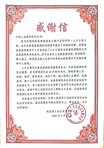 5月30日,中國二冶收到業(yè)主方新昌縣工業(yè)區(qū)發(fā)展有限公司發(fā)來的感謝信,對(duì)中國二冶在新昌智能裝備小鎮(zhèn)人才公寓項(xiàng)目建設(shè)中全體人員兢兢業(yè)業(yè)、敢打敢拼的奮斗精神予以肯定,對(duì)在疫情形勢(shì)下保障該項(xiàng)目施工節(jié)點(diǎn)所做出的卓越貢獻(xiàn)表示感謝。