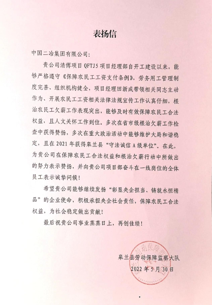 5月31日,中國二冶收到蘭州市皋蘭縣勞動(dòng)保障監(jiān)察大隊(duì)表揚(yáng)信,對中國二冶清傅項(xiàng)目部勞務(wù)用工實(shí)名制管理工作給予高度贊揚(yáng)和肯定。
