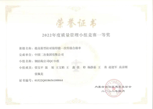 近年來(lái),中國(guó)二冶始終長(zhǎng)期堅(jiān)持走高技術(shù)高質(zhì)量創(chuàng)新發(fā)展之路,自上而下成立質(zhì)量管理QC小組,加大科技創(chuàng)新力度,不斷鼓勵(lì)科研人員廣泛開(kāi)展群眾性QC成果活動(dòng),加強(qiáng)工程實(shí)體質(zhì)量,打造精品工程,取得了突出成績(jī)。其中,中國(guó)二冶城建分公司淮安智慧谷科研成果轉(zhuǎn)化中心項(xiàng)目QC小組編寫(xiě)的《減少現(xiàn)澆梁與PC疊合板交界處的漏漿點(diǎn)》、鋼結(jié)構(gòu)分公司QC小組編寫(xiě)的《提高箱型柱對(duì)接焊縫一次焊接合格率》兩項(xiàng)QC成果榮獲內(nèi)蒙古自治區(qū)2022年度質(zhì)量管理小組競(jìng)賽一等獎(jiǎng)。