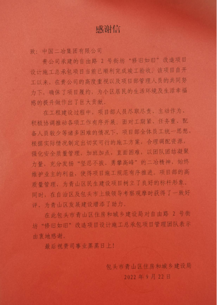 9月22日,中國二冶收到來自包頭市青山區(qū)住房和城鄉(xiāng)建設(shè)局的感謝信,對中國二冶在自由路 2 號街坊“修舊如舊”改造項目設(shè)計施工總承包項目中開展的工作給予高度贊揚。