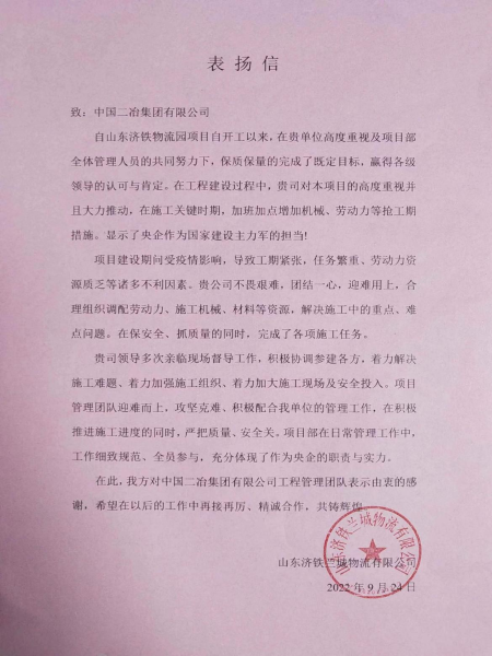 9月29日,山東濟鐵蘭城物流有限公司向中國二冶致表揚信,表揚中國二冶團結(jié)一心、迎難而上,在施工關鍵節(jié)點,加班加點搶工期,克服重重困難,保質(zhì)保量完成既定目標,充分展示出央企作為國家建設主力軍的擔當作為。