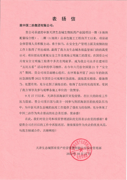 10月27日,天津生態(tài)城國(guó)有資產(chǎn)經(jīng)營(yíng)管理有限公司安全管理部向中國(guó)二冶致表?yè)P(yáng)信,對(duì)中國(guó)二冶集團(tuán)中新天津生態(tài)城生物醫(yī)藥產(chǎn)業(yè)園項(xiàng)目部自開(kāi)工以來(lái)積極主動(dòng)、勇于擔(dān)當(dāng)、提前謀劃、精心組織給予表?yè)P(yáng),同時(shí)對(duì)項(xiàng)目部在安全生產(chǎn)管理方面及疫情防控工作上所取得的突出成績(jī)表示了高度贊賞。
