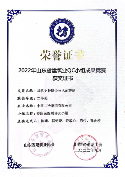 11月7日,由山東省建筑業(yè)協(xié)會和山東省建設(shè)工會聯(lián)合開展的2022年度山東省建筑業(yè)QC小組成果競賽活動(dòng)成績揭曉,中國二冶山東分公司棗莊人民醫(yī)院項(xiàng)目部QC小組研究課題《基坑支護(hù)降塵技術(shù)的研制》在活動(dòng)中榮獲二等獎(jiǎng)。