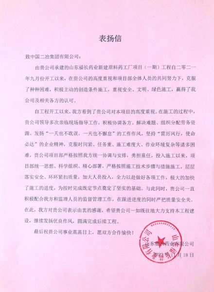 11月21日,山東福長(zhǎng)藥業(yè)有限公司致中國(guó)二冶表?yè)P(yáng)信,對(duì)中國(guó)二冶山東分公司承建的山東福長(zhǎng)藥業(yè)新建原料藥工廠(一期)項(xiàng)目不畏艱難、保證施工質(zhì)量表示認(rèn)可,對(duì)中國(guó)二冶項(xiàng)目管理團(tuán)隊(duì)的各項(xiàng)工作給予高度贊揚(yáng)。