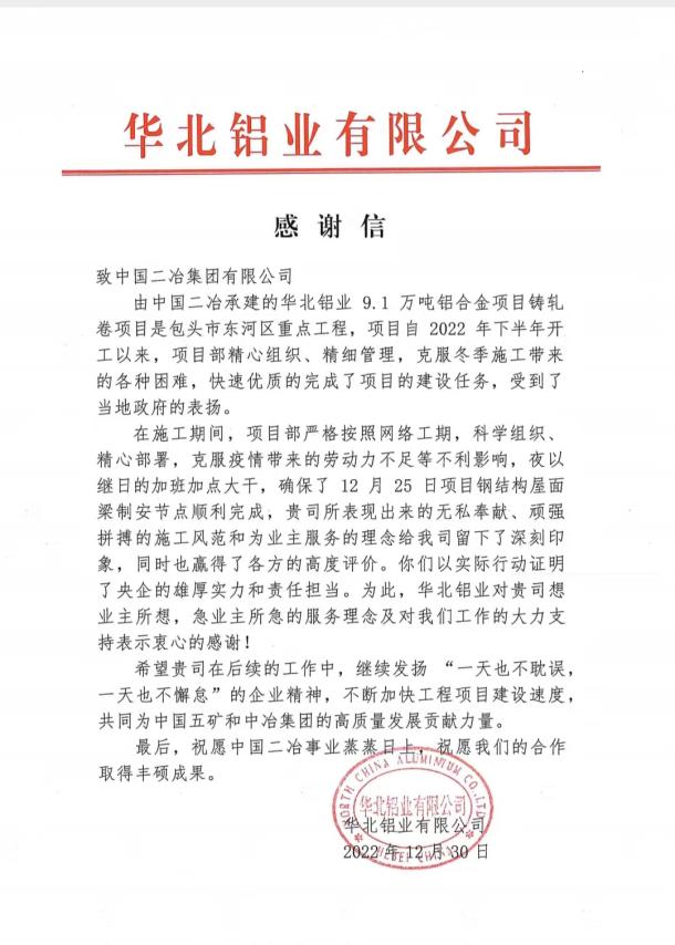 華北鋁業(yè)有限公司在信中指出,中國(guó)二冶在施工期間,嚴(yán)格按照網(wǎng)絡(luò)工期,科學(xué)組織、精心部署,克服疫情帶來的勞動(dòng)力不足等不利影響,夜以繼日加班加點(diǎn)大干,確保了12月25日項(xiàng)目鋼結(jié)構(gòu)屋面梁制安的順利結(jié)束,貴司所表現(xiàn)出來的無私奉獻(xiàn)、頑強(qiáng)拼搏的施工風(fēng)范和為業(yè)主服務(wù)的理念給我司留下了深刻印象,同時(shí)也贏得了各方的高度評(píng)價(jià)。你們以實(shí)際行動(dòng)證明了央企的雄厚實(shí)力和責(zé)任擔(dān)當(dāng)。