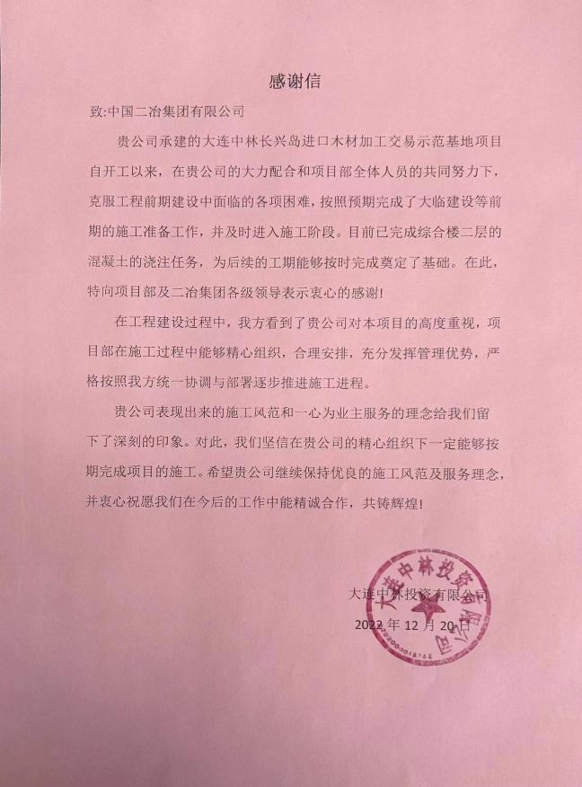 大連中林投資有限公司在信中指出,在工程建設(shè)過程中,我方看到貴司對(duì)本項(xiàng)目的高度重視,項(xiàng)目部在施工過程中能夠精心組織,合理安排,充分發(fā)揮管理優(yōu)勢(shì),嚴(yán)格按照我方統(tǒng)一協(xié)調(diào)與部署快速推進(jìn)施工速度,得到各方的贊賞。