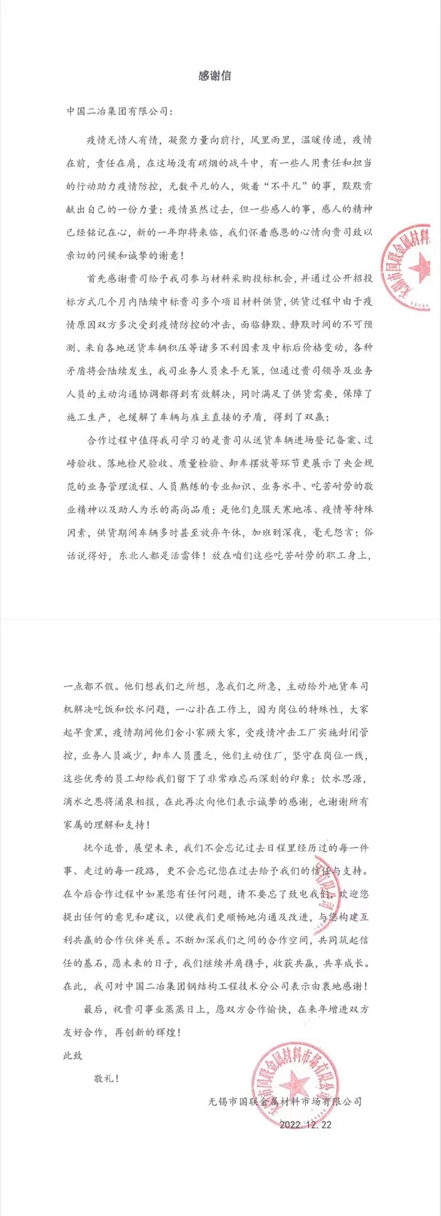 無錫市國(guó)聯(lián)金屬材料市場(chǎng)有限公司在感謝信中指出,撫今追昔,展望未來,我們不會(huì)忘記過去日子里經(jīng)歷過的每一件事,走過的每一段路,更不會(huì)忘記中國(guó)二冶在過去給予我們的信任與支持。讓我們構(gòu)建互利共贏的合作伙伴關(guān)系,不斷加深合作,共同筑起信任的基石,繼續(xù)并肩攜手,收獲共贏,共享成長(zhǎng)。
