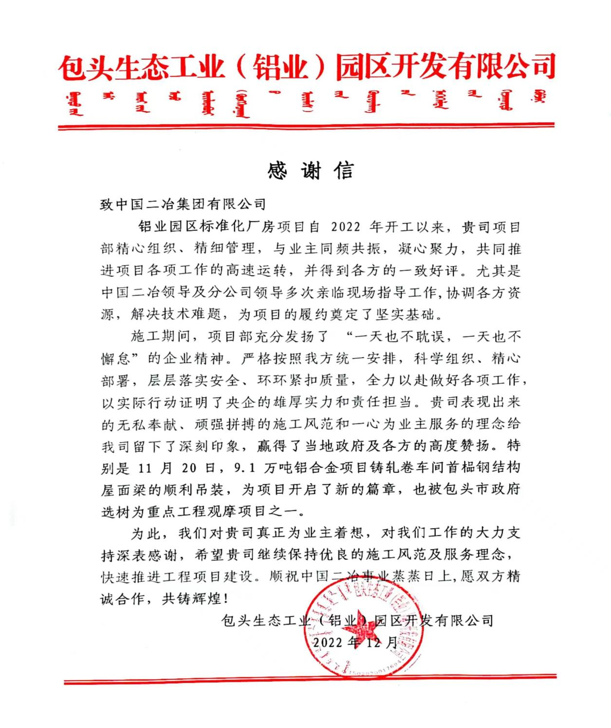 包頭生態(tài)工業(yè)(鋁業(yè))園區(qū)開發(fā)有限公司在感謝信中指出,在施工期間,中國(guó)二冶項(xiàng)目部充分發(fā)揚(yáng)了“一天也不耽誤,一天也不懈怠”的企業(yè)精神。嚴(yán)格按照我方統(tǒng)一安排,科學(xué)組織、精心部署,層層落實(shí)安全、環(huán)環(huán)緊扣質(zhì)量,全力以赴做好各項(xiàng)工作,以實(shí)際行動(dòng)證明了央企的雄厚實(shí)力和責(zé)任擔(dān)當(dāng)。貴司表現(xiàn)出來的無私奉獻(xiàn)、頑強(qiáng)拼搏的施工風(fēng)范和一心為業(yè)主服務(wù)的理念給我司留下了深刻印象,贏得了當(dāng)?shù)卣案鞣降母叨荣潛P(yáng)。