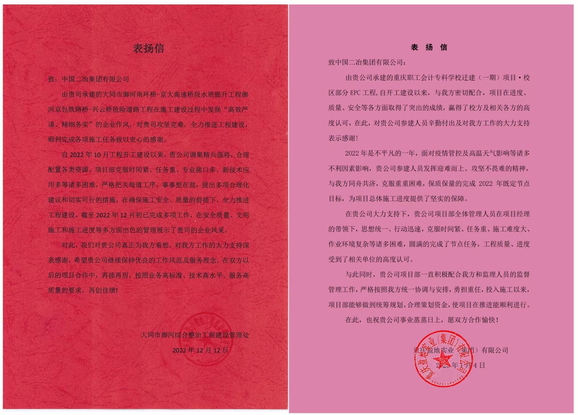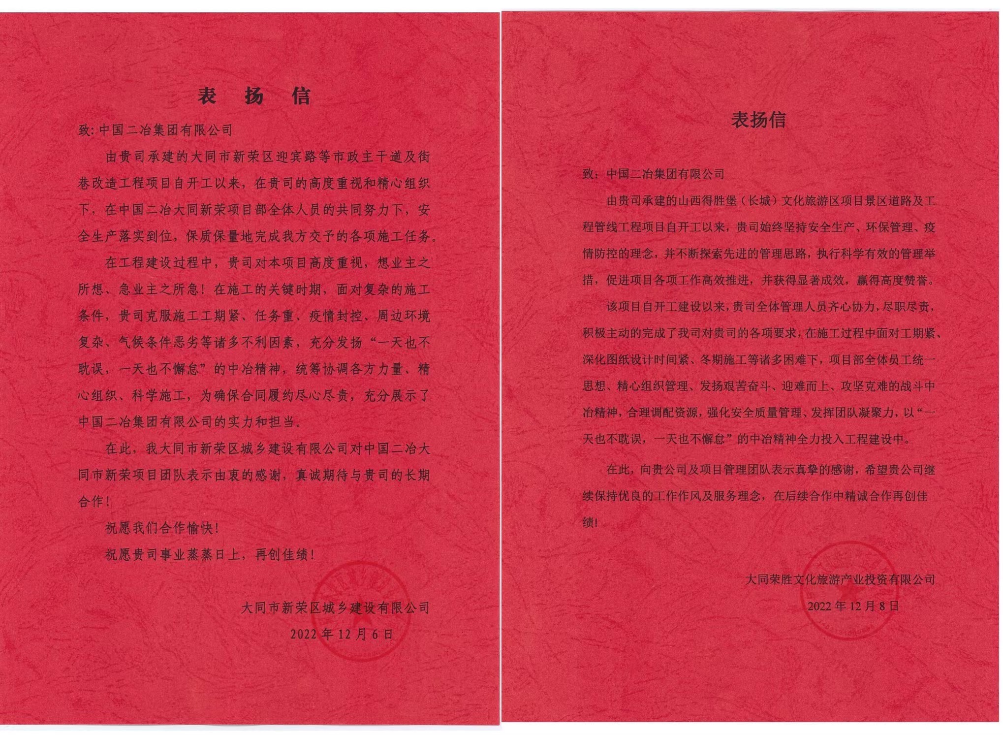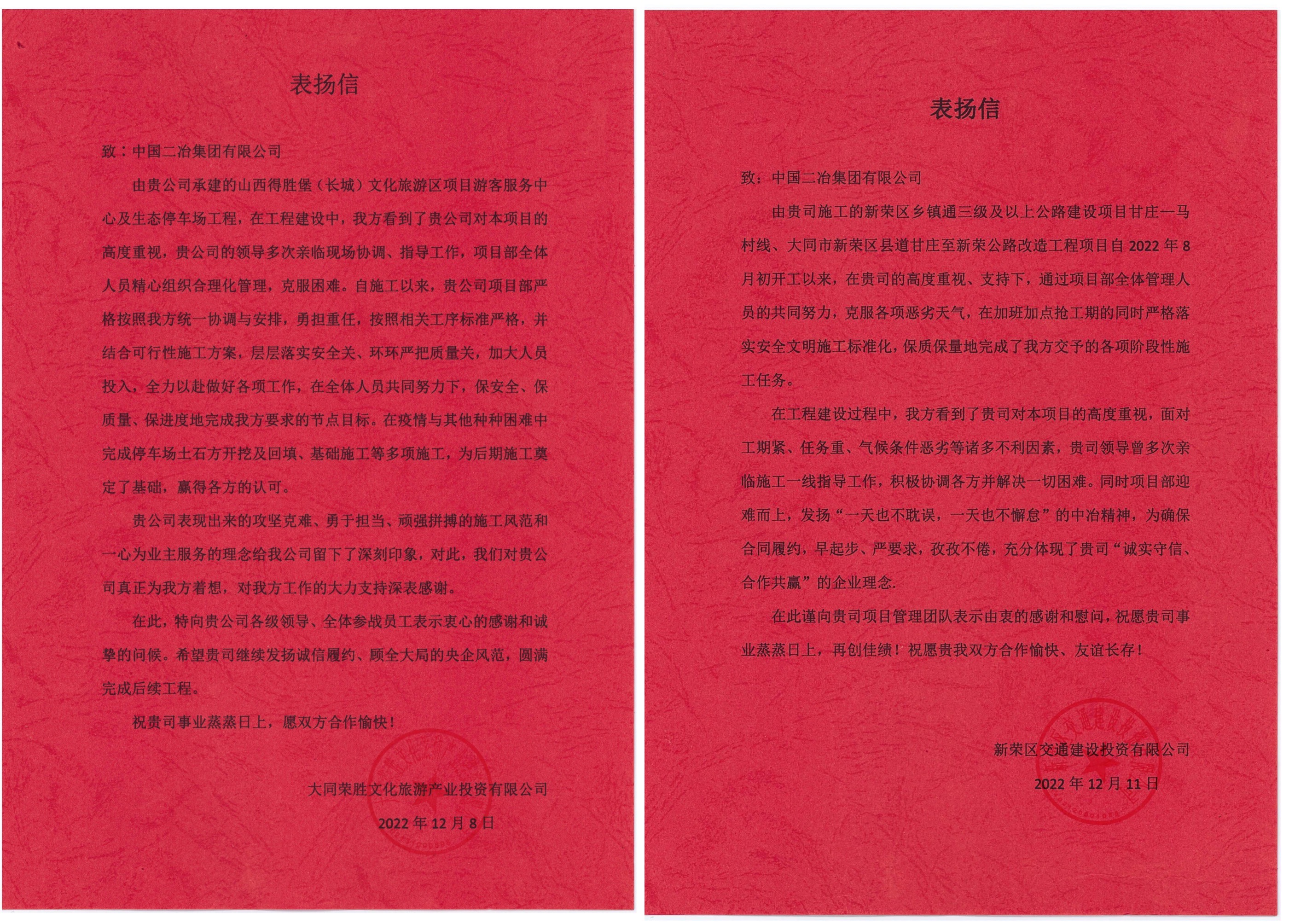 歲末年初,中國二冶各項(xiàng)目部陸續(xù)收到所承建的大同市新榮區(qū)迎賓路等市政工程項(xiàng)目、山西得勝堡游客服務(wù)中心及生態(tài)停車場(chǎng)工程項(xiàng)目、大同市新榮區(qū)新甘馬三級(jí)公路項(xiàng)目、山西得勝堡得勝廣場(chǎng)景區(qū)道路及工程管線工程項(xiàng)目、大同市御河搶險(xiǎn)道路工程項(xiàng)目、重慶職工會(huì)計(jì)??茖W(xué)校遷建(一期)項(xiàng)目以及金盛快速路北段——杭蓋路連接線項(xiàng)目共計(jì)七個(gè)項(xiàng)目業(yè)主單位的表揚(yáng)信。