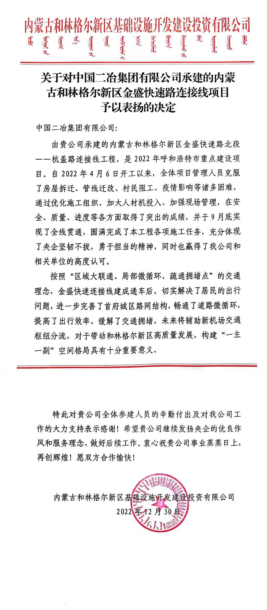 金盛快速路北段——杭蓋路連接線項(xiàng)目收到和林格爾新區(qū)基建公司表揚(yáng)信。信中寫到,金盛快速路連接線項(xiàng)目是2022年呼和浩特市重點(diǎn)建設(shè)項(xiàng)目。自2022年4月6日開工以來,全體項(xiàng)目管理人員克服了房屋拆遷、管線遷改、疫情影響等諸多困難,通過優(yōu)化施工組織,加大人材機(jī)投入,加強(qiáng)現(xiàn)場(chǎng)管理,在安全、質(zhì)量、進(jìn)度等各方面取得了突出的成績,并于9月底實(shí)現(xiàn)了全線貫通,圓滿完成了本工程各項(xiàng)施工任務(wù)。同時(shí),也贏得了我公司和相關(guān)單位的高度認(rèn)可。