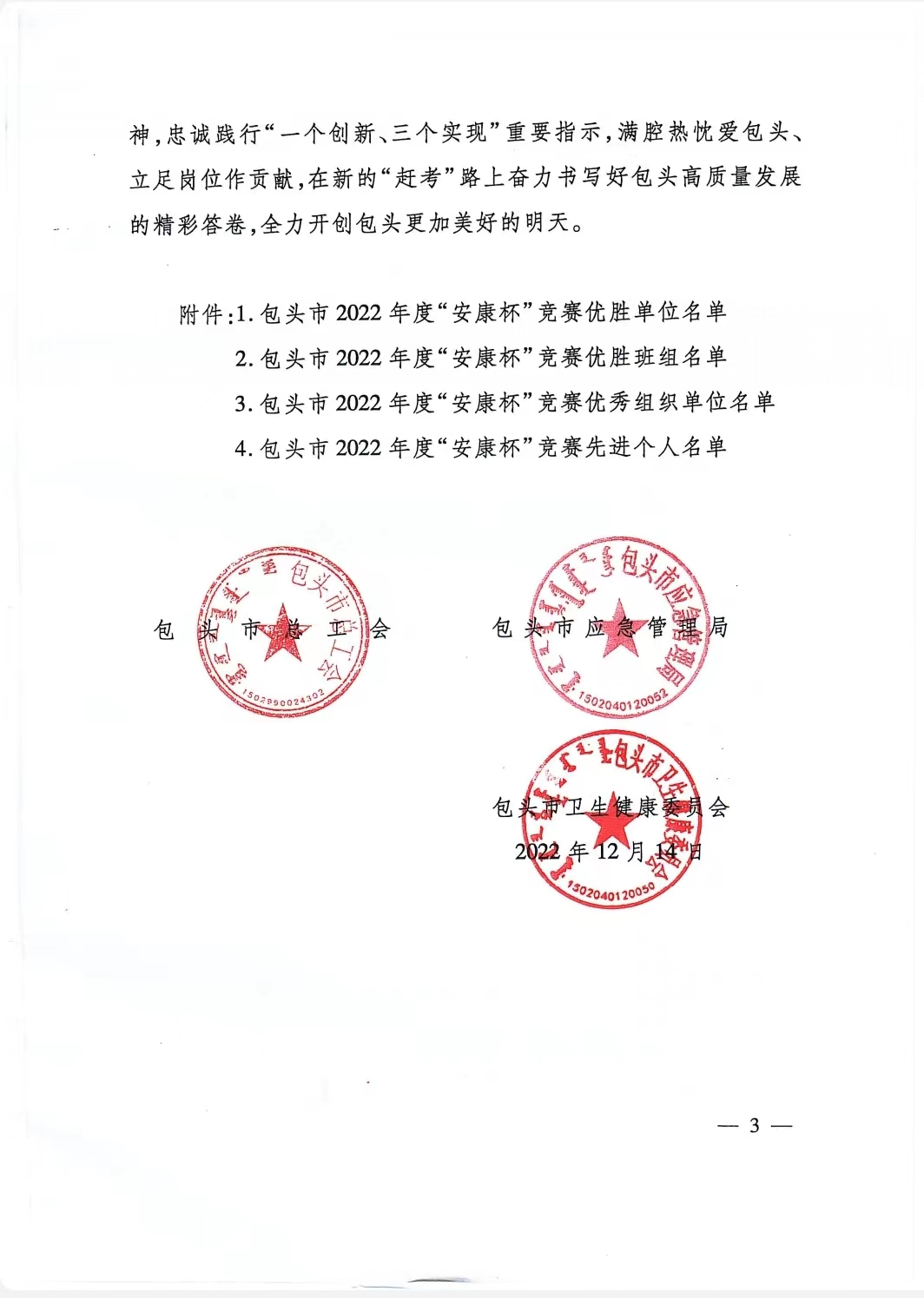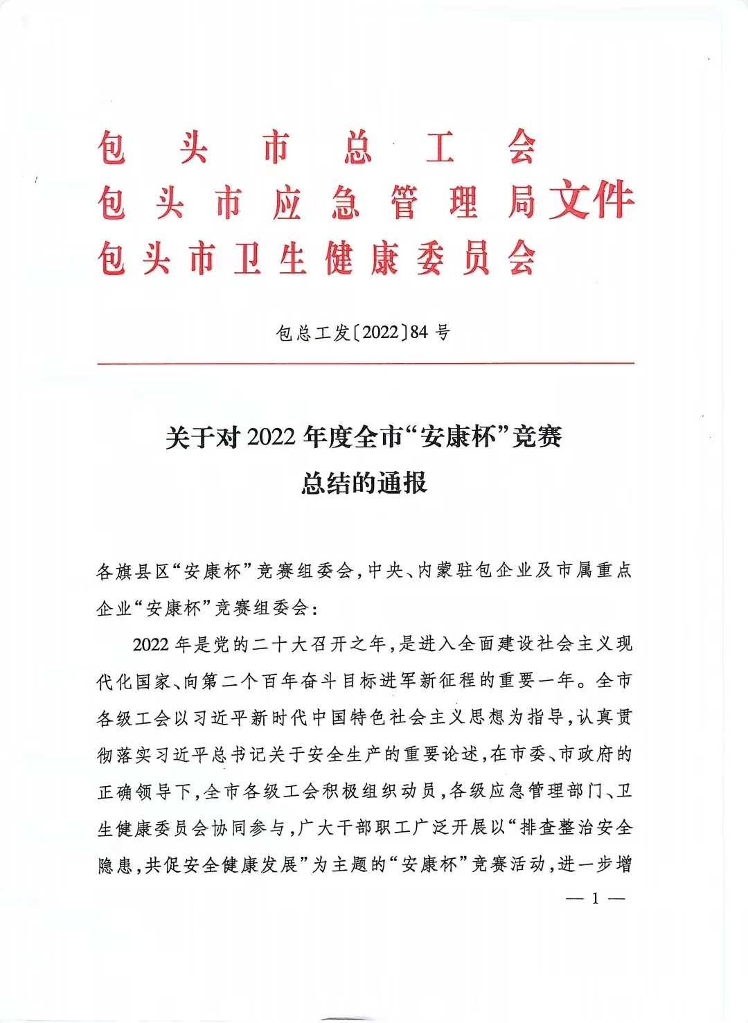 “安康杯”競(jìng)賽活動(dòng)是由包頭市總工會(huì)和包頭市應(yīng)急管理部及包頭市衛(wèi)生健康委員會(huì)聯(lián)合組織的安全生產(chǎn)競(jìng)賽評(píng)比活動(dòng),旨在通過(guò)競(jìng)賽安全生產(chǎn)管理、領(lǐng)導(dǎo)者安全生產(chǎn)意識(shí)、職工安全生產(chǎn)知識(shí)水平和能力、安全生產(chǎn)各項(xiàng)指標(biāo)評(píng)比,不斷推動(dòng)企事業(yè)單位的安全生產(chǎn)工作和安全文化建設(shè),不斷擴(kuò)大社會(huì)影響,提高全民安全生產(chǎn)意識(shí),最終降低各類(lèi)事故的發(fā)生率和各類(lèi)職業(yè)病的發(fā)病率。