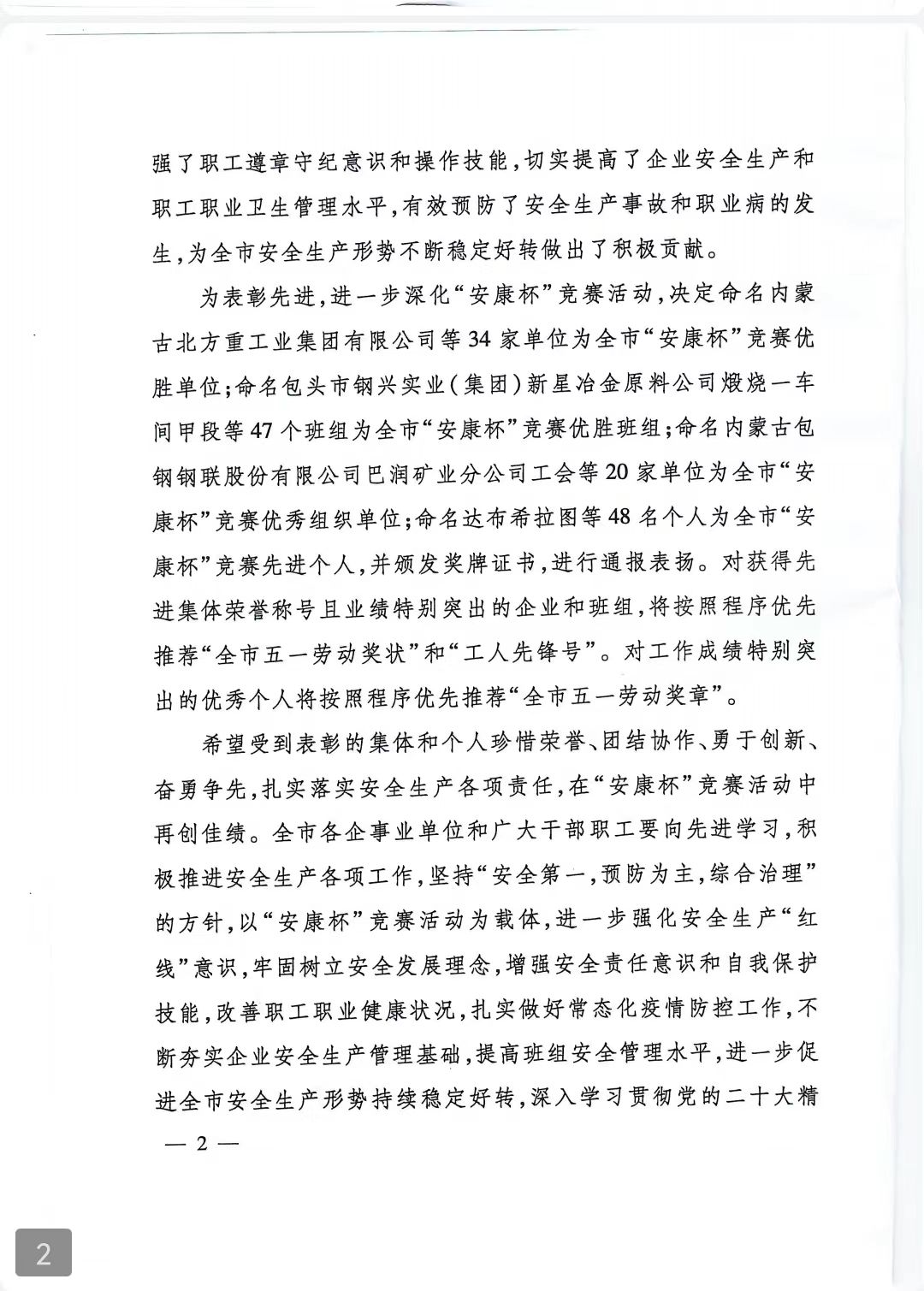 近日,包頭市總工會(huì)召開(kāi)2022年度“安康杯”競(jìng)賽總結(jié)暨經(jīng)驗(yàn)交流會(huì),中國(guó)二冶路橋分公司榮獲包頭市“安康杯”競(jìng)賽2022年度優(yōu)勝單位稱(chēng)號(hào),中國(guó)二冶鋼構(gòu)分公司榮獲優(yōu)勝班組稱(chēng)號(hào),公司工會(huì)陳剛榮獲先進(jìn)個(gè)人。