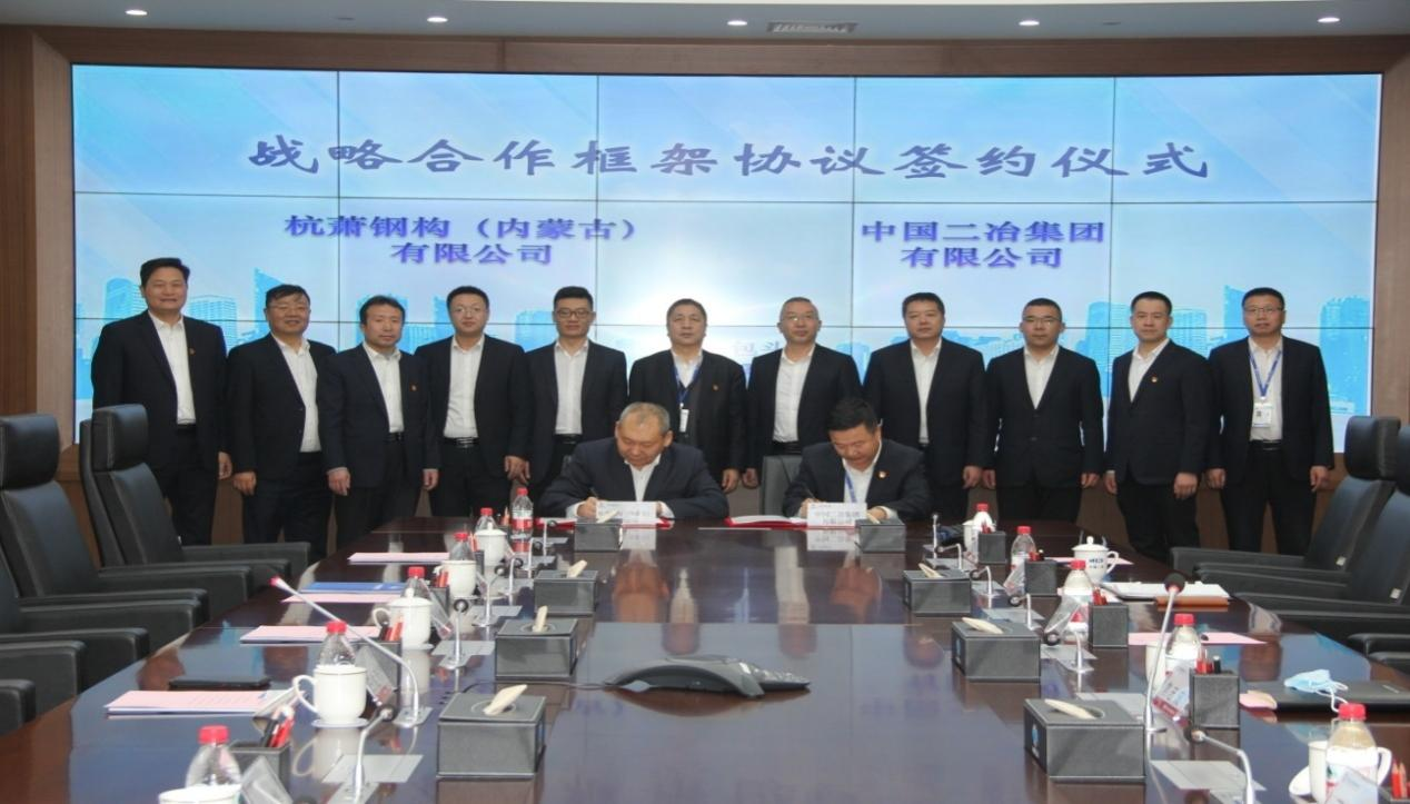 鋼構(gòu)分公司黨委書記、總經(jīng)理王志義與杭蕭鋼構(gòu)(內(nèi)蒙古)有限公司總經(jīng)理王勝利簽署戰(zhàn)略合作框架協(xié)議。