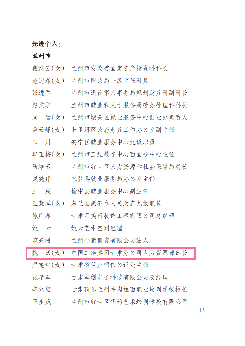 2月16日,甘肅省人力資源和社會(huì)保障廳發(fā)布《關(guān)于表彰甘肅省就業(yè)創(chuàng)業(yè)工作先進(jìn)集體和先進(jìn)個(gè)人的決定》。中國(guó)二冶甘肅分公司魏躍喜獲“甘肅省就業(yè)創(chuàng)業(yè)先進(jìn)個(gè)人”稱號(hào)。這是中國(guó)二冶甘肅分公司被認(rèn)定為“甘肅省勞動(dòng)關(guān)系和諧企業(yè)”后,甘肅省人力資源和社會(huì)保障廳對(duì)中國(guó)二冶的再次肯定和獎(jiǎng)勵(lì)。