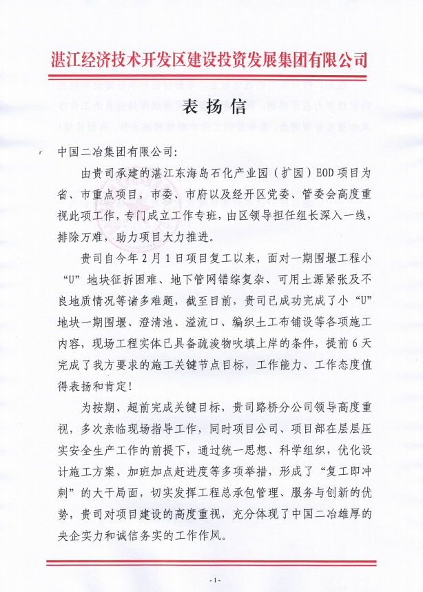 2月28日,中國(guó)二冶湛江東海島產(chǎn)業(yè)園(擴(kuò)園)EOD項(xiàng)目收到業(yè)主單位湛江經(jīng)濟(jì)技術(shù)開發(fā)區(qū)建設(shè)投資發(fā)展集團(tuán)有限公司表?yè)P(yáng)信,對(duì)中國(guó)二冶攻堅(jiān)克難,高效推進(jìn)項(xiàng)目進(jìn)度,超前完成工程節(jié)點(diǎn)和任務(wù)目標(biāo)提出表?yè)P(yáng)與肯定。