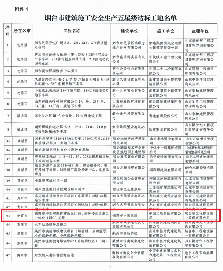 3月8日,中國二冶收到煙臺市住房和城鄉(xiāng)建設局《關于公布2022年度全市建筑施工安全生產星級達標工地的通知》,由中國二冶承建的棲霞市中醫(yī)醫(yī)院擴建新區(qū)門診、病房樓設計施工一體化(EPC)工程獲評煙臺市“建筑施工安全生產五星級達標工地”,該獎項為煙臺市建筑安全文明施工領域最高榮譽。