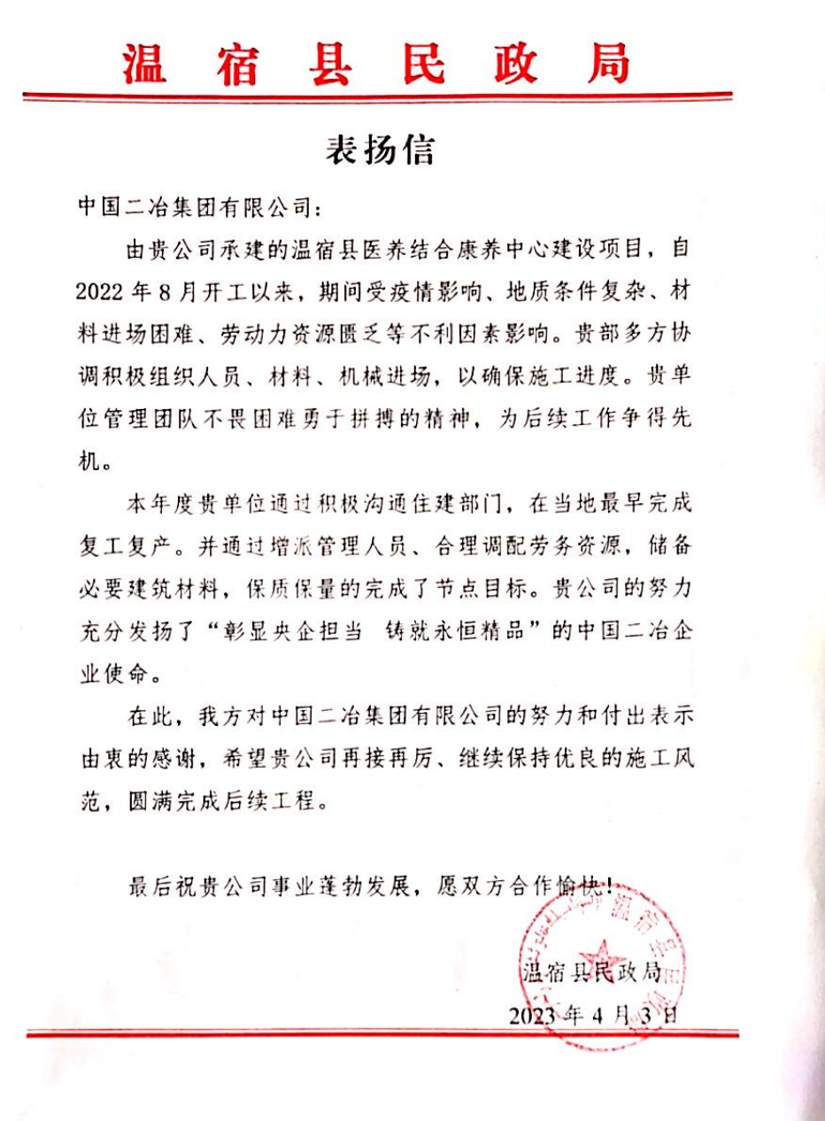 4月11日,中國二冶收到新疆阿克蘇地區(qū)溫宿縣民政局表揚(yáng)信,對(duì)溫宿縣醫(yī)養(yǎng)結(jié)合康養(yǎng)中心建設(shè)項(xiàng)目在施工過程中高效率、高質(zhì)量完成節(jié)點(diǎn)目標(biāo)表示高度肯定,對(duì)溫宿項(xiàng)目建設(shè)過程中不畏困難勇于拼搏的精神進(jìn)行贊揚(yáng)。