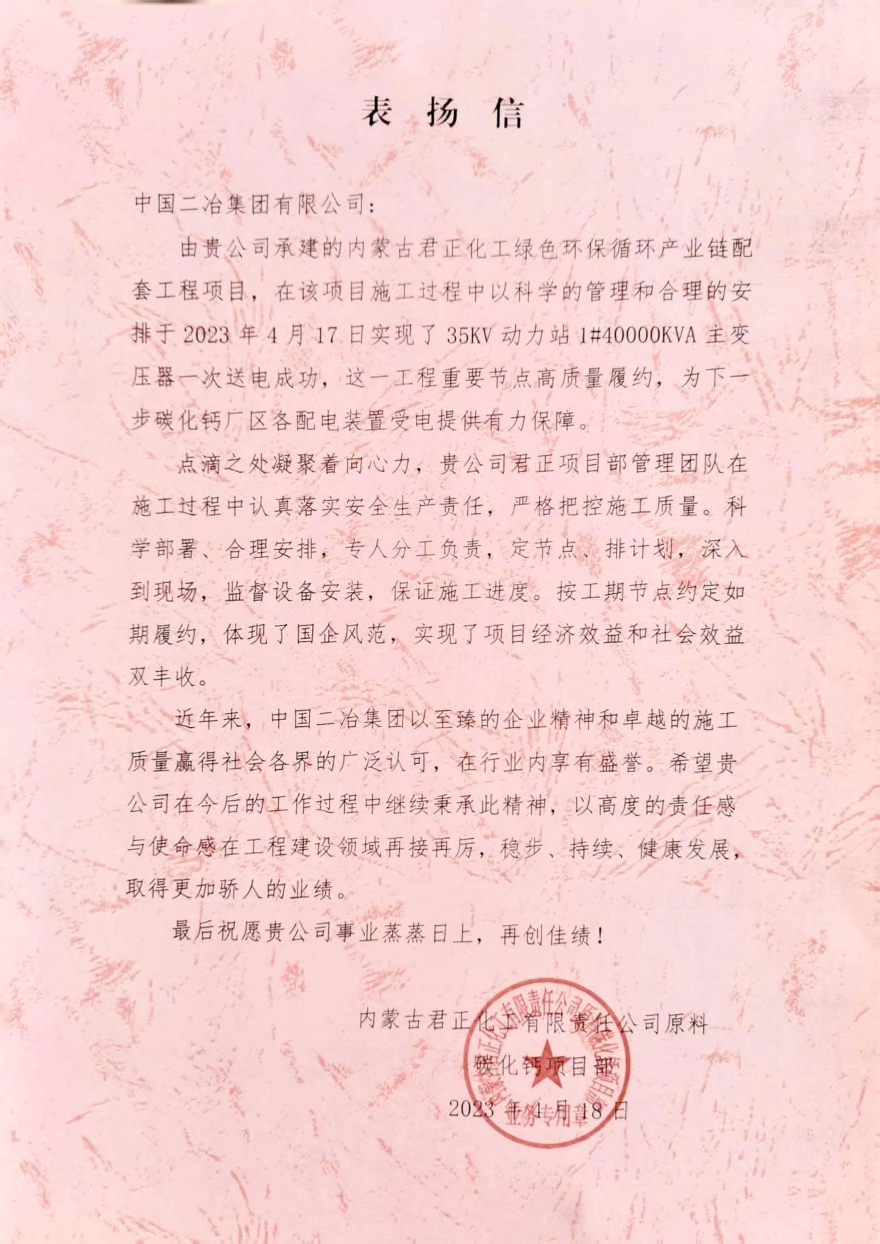 4月19日,中國二冶收到內(nèi)蒙古君正化工有限公司表揚(yáng)信,對(duì)中國二冶君正項(xiàng)目部能打硬仗、能打勝仗的國企鐵軍作風(fēng)給予了的高度認(rèn)可和贊揚(yáng)。