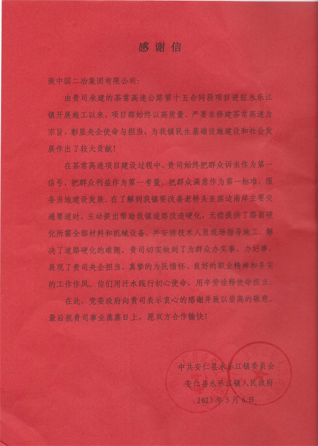 5月6日,中國二冶茶常高速公路第15合同段項目部收到安仁縣永樂江鎮(zhèn)人民政府感謝信。信中對茶常高速項目部在服務當?shù)亟ㄔO發(fā)展過程中的大力支持和無私奉獻表示衷心的感謝和崇高的敬意。